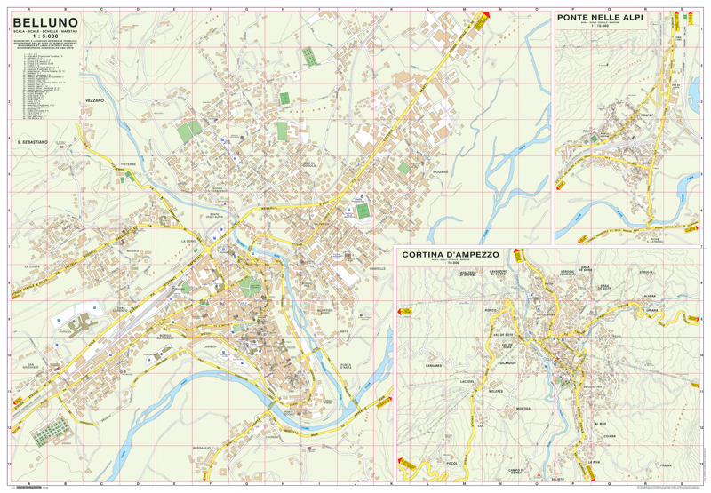 Clearly-drawn street map/.plan of the city of Belluno (Veneto) and its surrounds showing places of interest including public buildings, monuments, churches, cultural attractions, car parks, railway lines and parks. Includes an inset of Ponte Nelle Alpi shown at 1: 10,000 and another of Cortina D’Ampezzo shown at 1: 10,000. There is also a comprehensive street index as well as an index of places of interest.