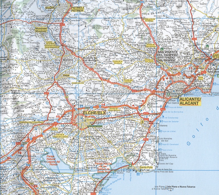 This detailed large scale map of the Costa del Azahar region of Spain shows a wealth of information for travellers. T he road network is clearly marked and well differentiated by colour and with route numbers and intermediate driving distances given and numerous minor roads and tracks shown. Steep gradients are also marked and scenic and tourist routes highlighted. Relief shading is included to indicate terrain and spot heights shown together with mountain passes. The map also indicates rivers, ferry routes, airports, railways and a wealth of places of interest as well as beaches, campsites, hostels and hotels. The map includes inset street plans of Valencia, Alicante and Murcia Santa Barbara, Murcia and Almeria and comes with a comprehensive 31-page place names index booklet.