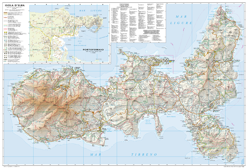 Tourist road map of the island of Elba in Tuscany. Roads are clearly marked and differentiated according to size, with distances given for major roads and tracks and trails also marked. Hill shading is included and spot heights marked. The map also shows administrative boundaries and ferry routes together with a variety of tourist information including campsites, airports, places of interest and viewpoints. The map includes an inset street plan of Portoferraio (1:4,500) while the reverse features a wealth of tourist information.