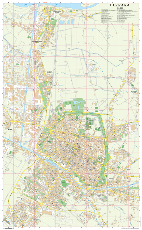 Clearly-drawn street map/plan of the city of Ferrara (Emilia-Romagna) and its suburbs showing places of interest including public buildings, monuments, churches, cultural attractions, car parks, parks and railway lines. Includes a comprehensive index of streets and index of places of interest.