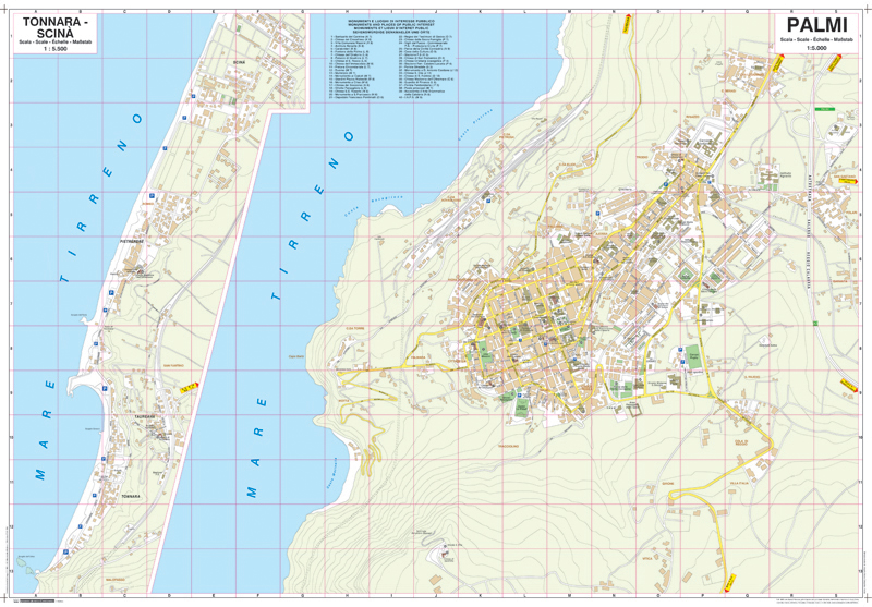 Detailed street map/plan of the city of Palmi and its suburbs showing places of interest including public buildings, monuments, churches, cultural attractions, car parks, parks and railway lines. The reverse includes tourist information in Italian, English, German and French. There is also an inset map of Tonnara-Scina shown at 1: 5,500 plus a black and white map of the general area from Rosarno in the north to Montebello in the south. The map also includes a street index plus an index to the places of interest marked.