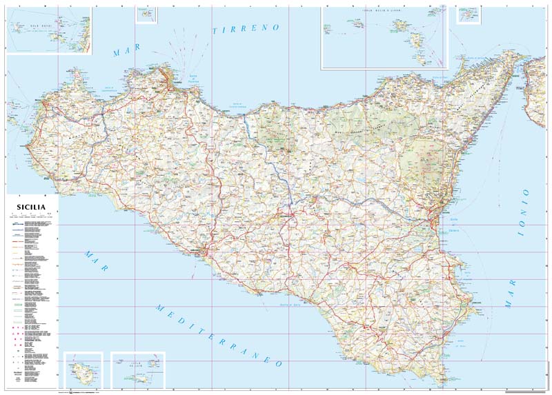 Map of Sicily (Sicilia) shown at 1: 250,000 with the smaller offshore islands shown as insets and a comprehensive place names index on the reverse.