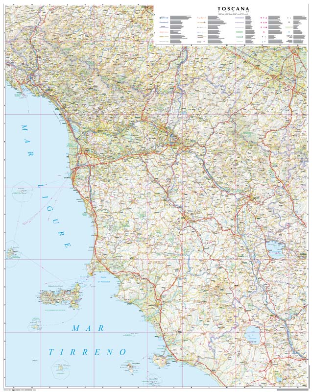 Regional road map of the beautiful central Italian region of Tuscany (capital Florence) complete with comprehensive place names index. Features a wealth of practical and tourist information including attractions and places of interest, national parks, railways, road distances, campsites and viewpoints.