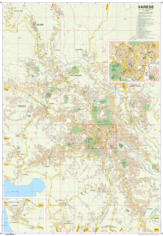 Clearly-drawn street map of the city of Varese, in the North Italian region of Lombardy, and its surrounds, showing places of interest including public buildings, monuments, churches, cultural attractions, car parks, railways and parks. The plan also includes a full street index and an index of places of interest.