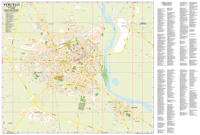 Street map of the city of Vercelli, in the region of Piedmont, North Italy, and its suburbs, showing places of interest including public buildings, monuments, churches, cultural attractions, parks and railway lines. There is also a comprehensive street index on the reverse plus an index to the places of interest marked. The map also features tourist information in Italian, English, French and German.